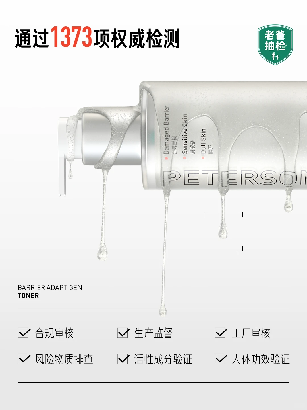 当然,除了产品本身,老爸评测还对毕生之研进行追根溯源,追溯到产品的生产、研发环节,品牌必须要通过1373项检测,才能被最终授予“老爸抽检”的标志。